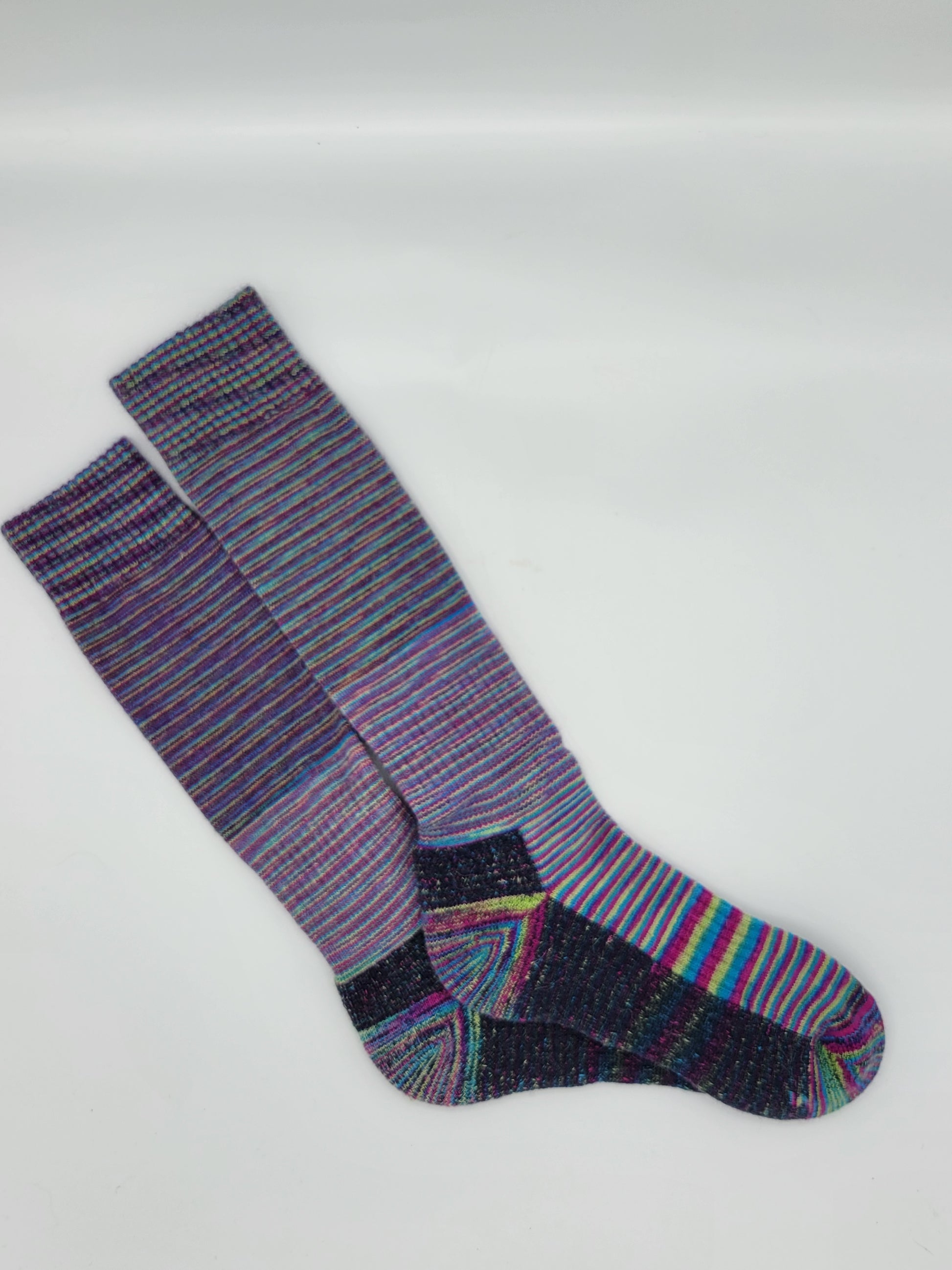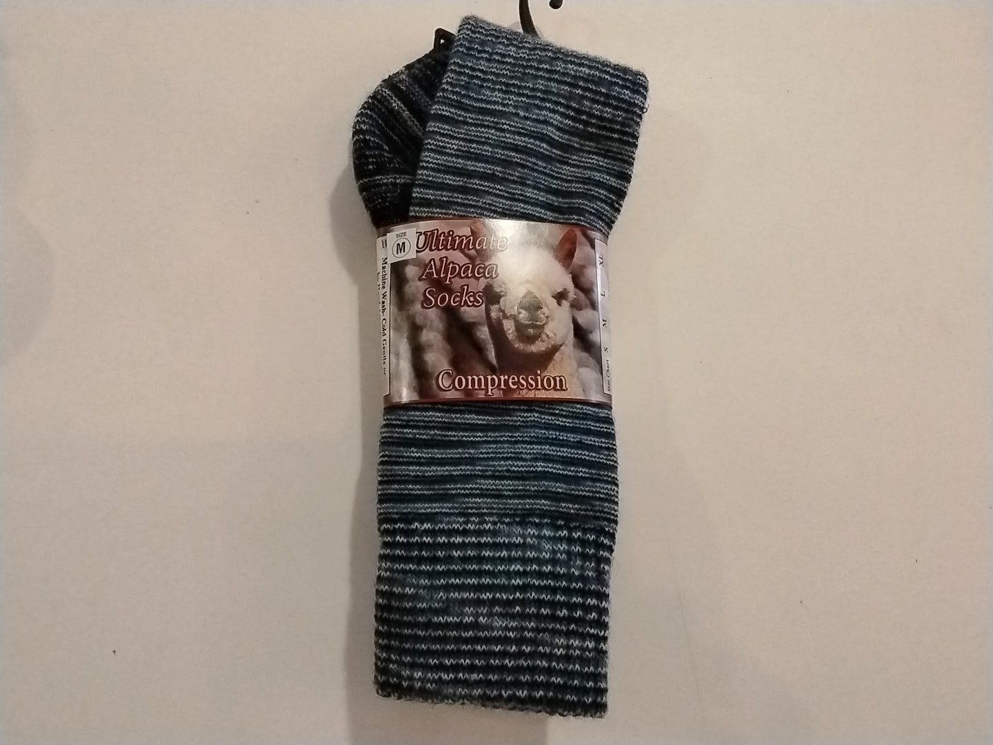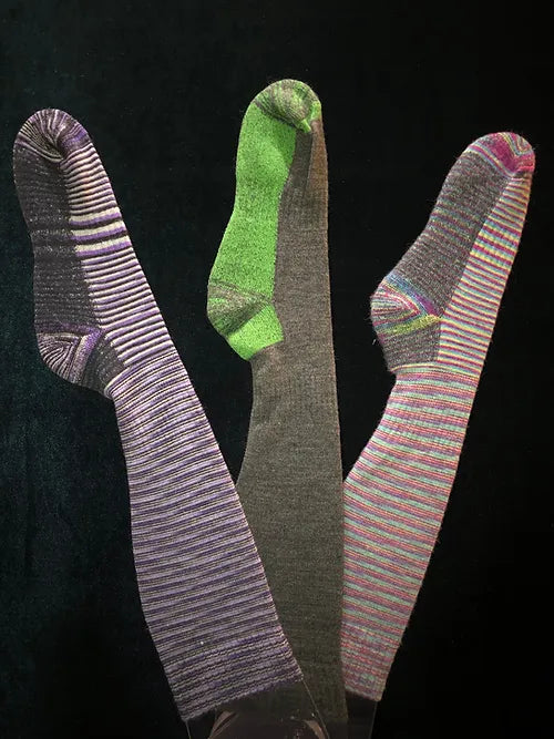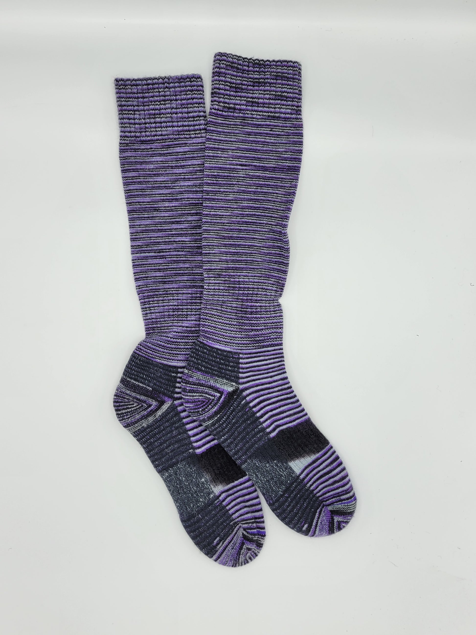 Live life to its fullest in a new multi color KNEE HIGH Compression Sock! Wear these eye catching, comfortable alpaca socks any day of the week. They come in the Multi-color mixed Purple & Gray. The bottom foot is a very dense cushioned terry that provides arch support and has heel and toe reinforcement. Machine washable.